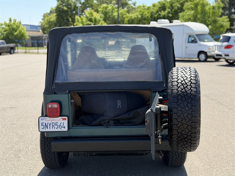 1997 Jeep Wrangler SE — Green exterior, tan cloth interior — powered by a 2.0L naturally aspirated I4 OHV 8-valve engine. Factory equipment includes 4-wheel drive with low-range transfer case, removable soft top and removable doors, tan cloth seating, basic AM/FM radio with cassette, manual climate controls (heater and A/C when equipped), steel wheels, power steering, and the standard safety features for the model year. Below 192,000 miles (averaging under 7,000 miles per year), excellent overall condition, 17 MPG city / 19 MPG highway, clean CARFAX.