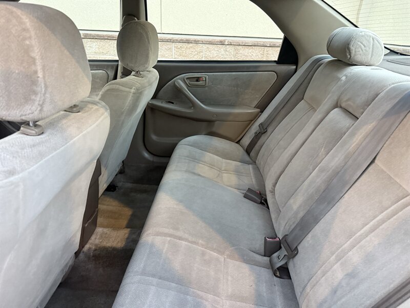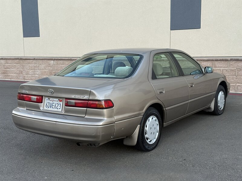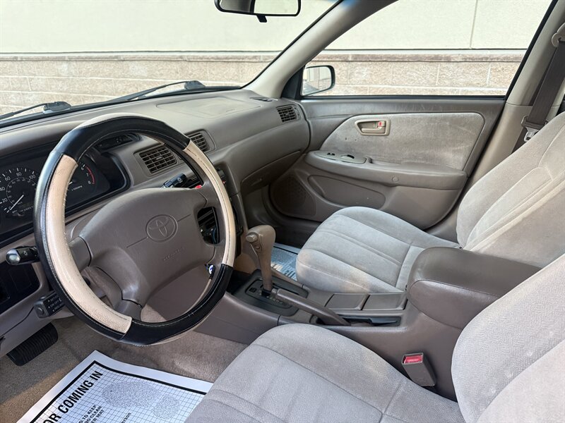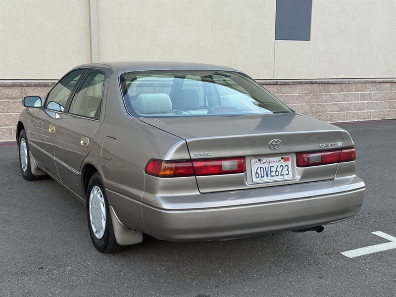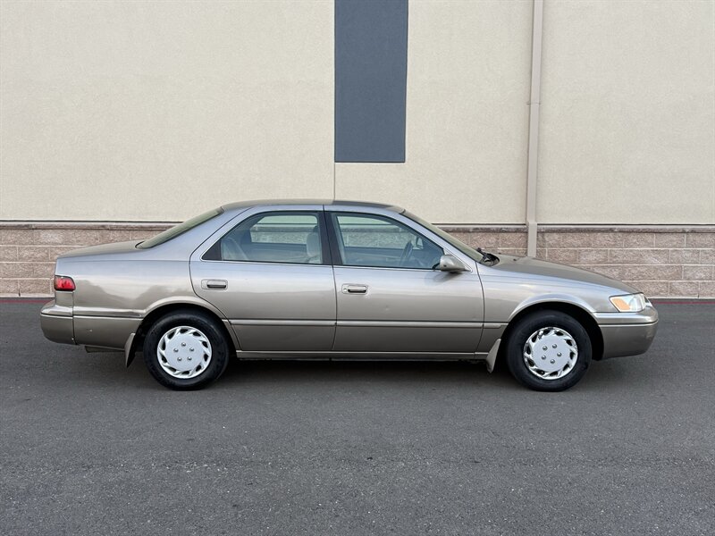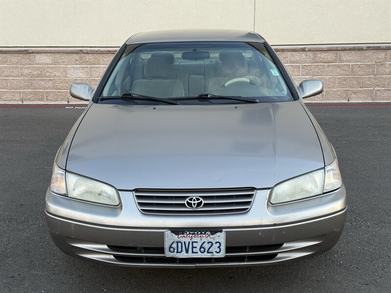 1999 Toyota Camry CE powered by a 2.0L naturally aspirated I4 DOHC 16-valve engine; exterior in Sable Pearl with Oak cloth interior and showing under 219,000 miles (averaging less than 8,000 miles per year). Factory equipment includes air conditioning, Oak cloth front bucket seats and rear bench, tilt-adjustable steering column, AM/FM stereo with cassette, power steering with power-assisted brakes, dual front airbags, intermittent windshield wipers, center console storage and 14-inch steel wheels with full covers.