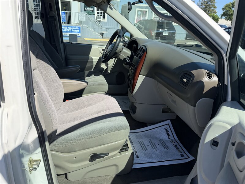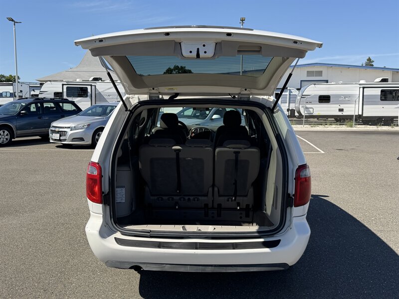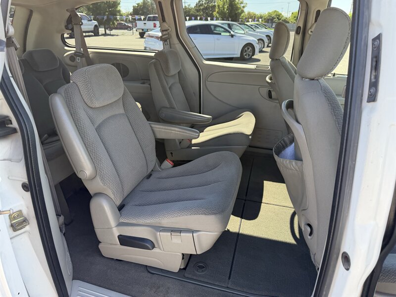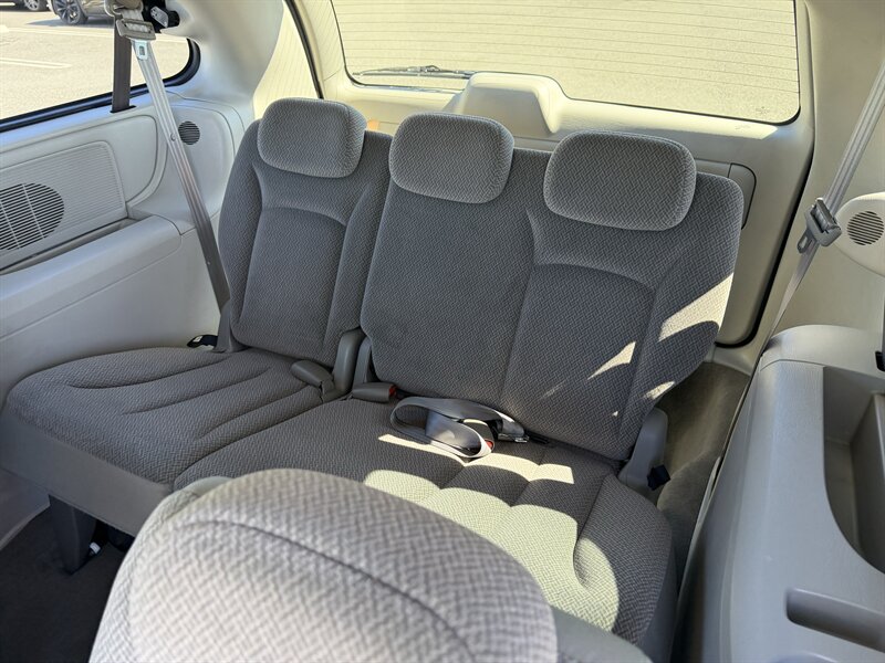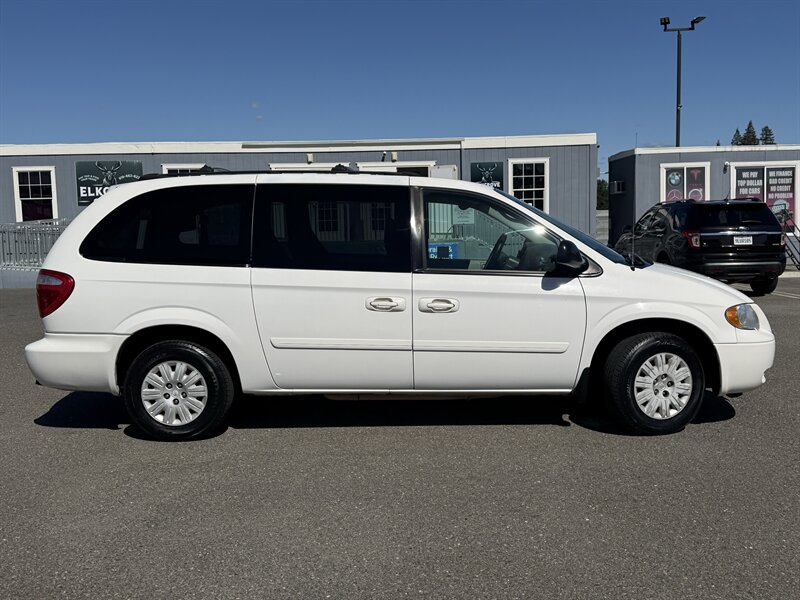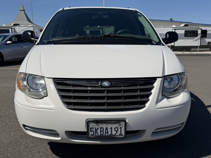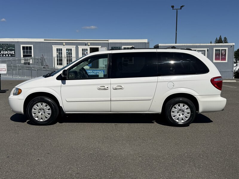 2005 Chrysler Town & Country LX — exterior blanco, interior en tela gris. Motor 3.3L V6 con 180 hp y 210 lb-ft de torque. Equipamiento de fábrica: capacidad para siete ocupantes con los asientos de la segunda fila Stow ’n Go que se pliegan completamente y tercera fila 60/40, tapicería de tela, aire acondicionado con controles HVAC traseros, radio AM/FM con reproductor de CD, elevalunas y seguros eléctricos, entrada remota sin llave, control de crucero, columna de dirección inclinable, barras en el techo y lunas tintadas. Seguridad: bolsas de aire delanteras, bolsas de aire tipo cortina y frenos ABS. Menos de 133,000 millas (promedio bajo 7,000 millas/año), consumo 17 MPG ciudad / 24 MPG carretera. Excelente condición general, CARFAX limpio, un solo propietario.