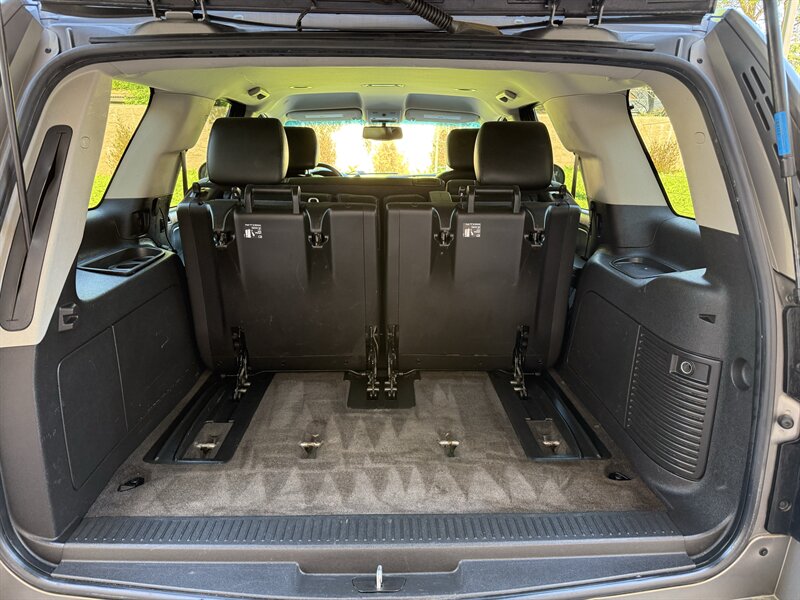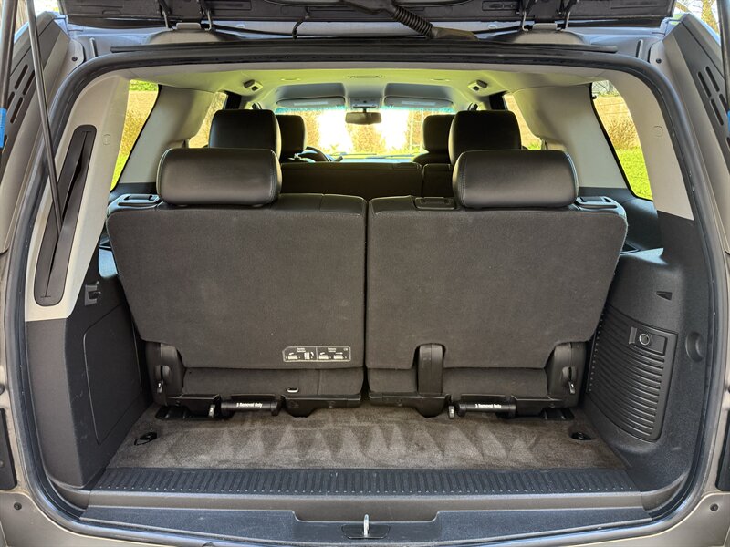 2012 Chevrolet Tahoe LT with the Vortec Iron Block 5.3L FlexFuel V8 (320 hp, 335 lb-ft). Factory features include a six-speed automatic transmission, three-row seating with Ebony leather-appointed seats, power-adjustable front seats, tri-zone automatic climate control, steering-wheel-mounted audio and cruise controls, AM/FM/CD audio with auxiliary/USB inputs and Bluetooth hands-free connectivity, power windows and door locks, remote keyless entry, rear parking sensors and available rearview camera provisions, roof rails and towing capability. Safety systems include StabiliTrak electronic stability control, traction control, four-wheel anti-lock disc brakes, front-seat side-impact airbags and full-length side curtain airbags, tire pressure monitoring, and OnStar capability. Exterior is Gold Mist Metallic; vehicle is in excellent overall condition with a clean CARFAX report.