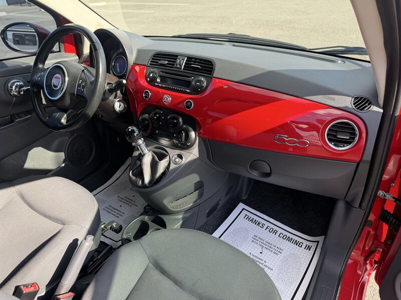 2012 FIAT 500 Pop — Red exterior, Black cloth interior. This vehicle is powered by a 1.4L I4 engine producing 101 hp and 98 lb-ft of torque, and it delivers excellent fuel economy: approximately 30 MPG city and 38 MPG highway. The odometer reads under 100,000 miles, averaging less than 7,000 miles per year. The car is in excellent overall condition and comes with a clean CARFAX report.