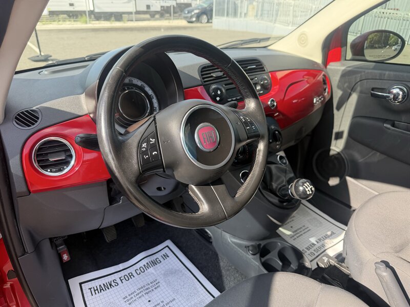2012 FIAT 500 Pop — Exterior rojo, interior en tela negra. Este vehículo está equipado con un motor 1.4L I4 que entrega 101 hp y 98 lb-ft de torque, y ofrece muy buena eficiencia de combustible: aproximadamente 30 MPG en ciudad y 38 MPG en carretera. El odómetro marca menos de 100,000 millas, con un promedio de menos de 7,000 millas por año. El automóvil se encuentra en excelente estado general y cuenta con un informe CARFAX limpio.