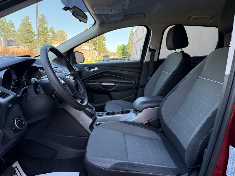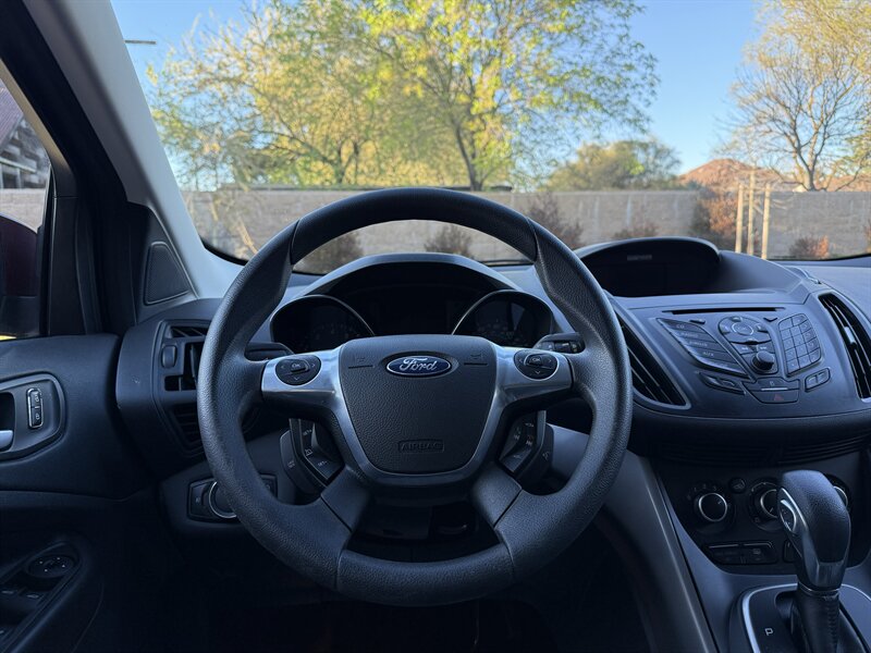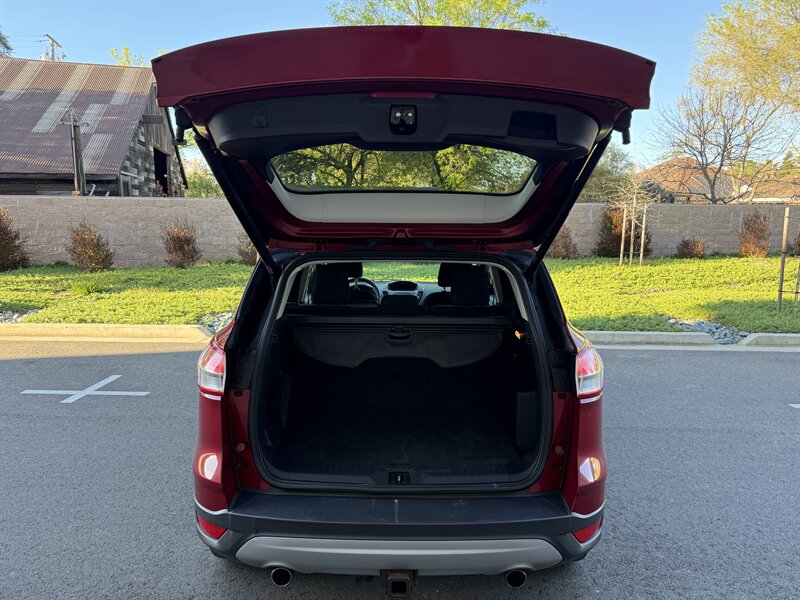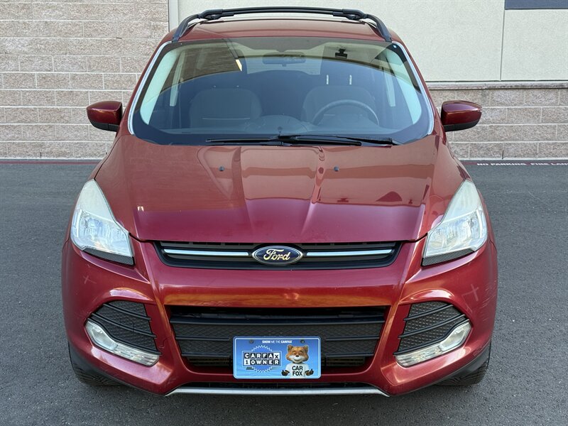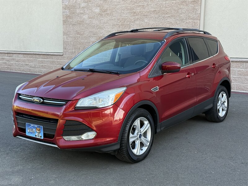 2013 Ford Escape SE en rojo con interior de tela gris, impulsado por un EcoBoost 2.0L Turbo I4 (240 hp, 270 ft-lbs). El kilometraje está por debajo de 129,000 millas, con un promedio inferior a 10,000 millas por año. El equipo de fábrica incluye aire acondicionado, asientos de tela con cojín trasero plegable 60/40, ventanas y seguros eléctricos, entrada remota sin llave, espejos laterales eléctricos, control de crucero, volante inclinable con controles de audio en el volante, sistema de audio AM/FM/CD con entradas auxiliar/USB y manos libres Bluetooth (Ford SYNC), llantas de aleación, ABS con control electrónico de estabilidad y tracción, bolsas de aire frontales laterales y de cortina, monitor de presión de neumáticos y anclajes LATCH para sillas infantiles, además de portón trasero y amplio espacio de carga.