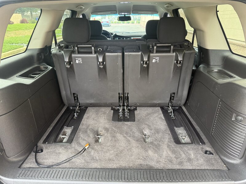 Factory-standard comfort and convenience features include seating for up to eight with a split-folding second row and a fold-flat third-row bench to expand cargo capacity, cloth upholstery in Ebony, and power accessories (windows, door locks and mirrors). Interior conveniences from the factory include cruise control, a tilt-and-telescoping steering column, steering-wheel-mounted audio controls, and multiple 12V/auxiliary power access points. Climate comfort is addressed with front and rear ventilation and driver-oriented controls for everyday usability.