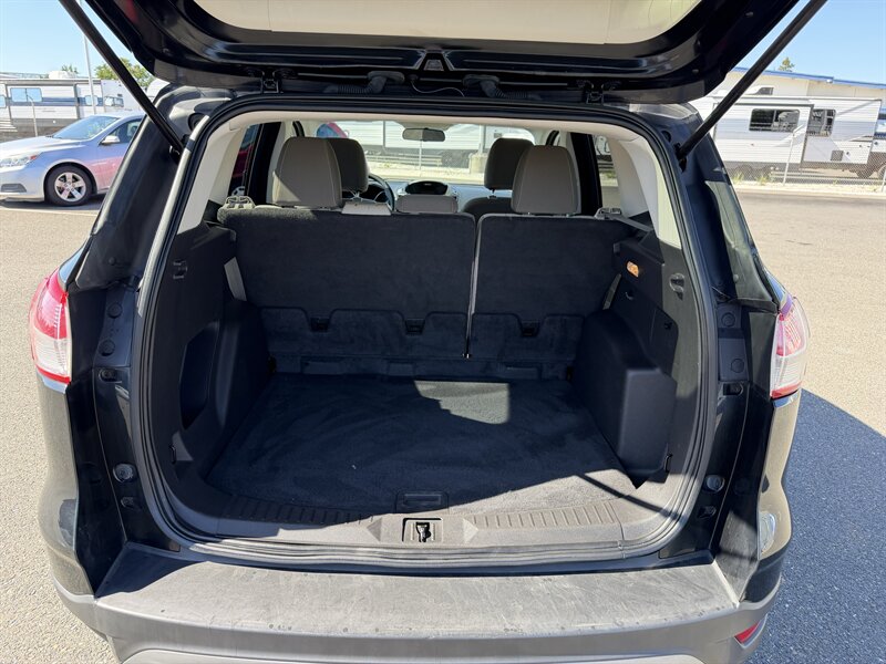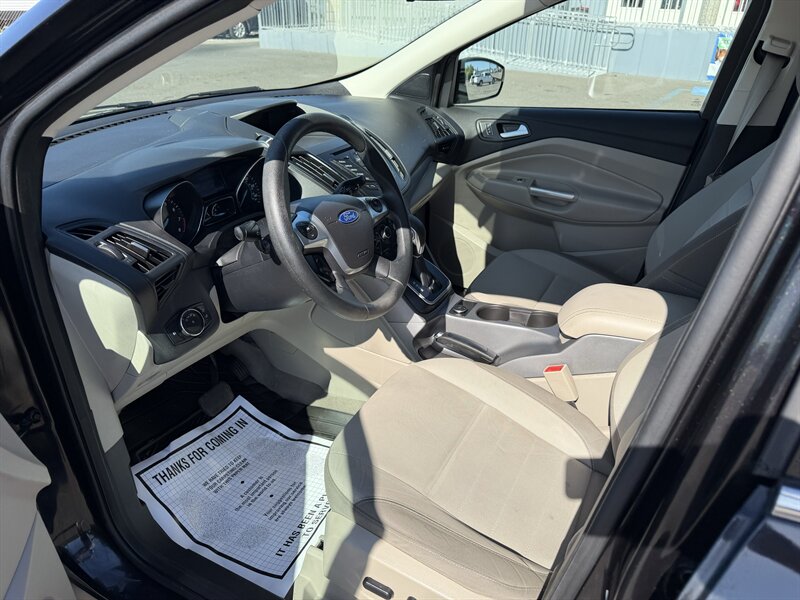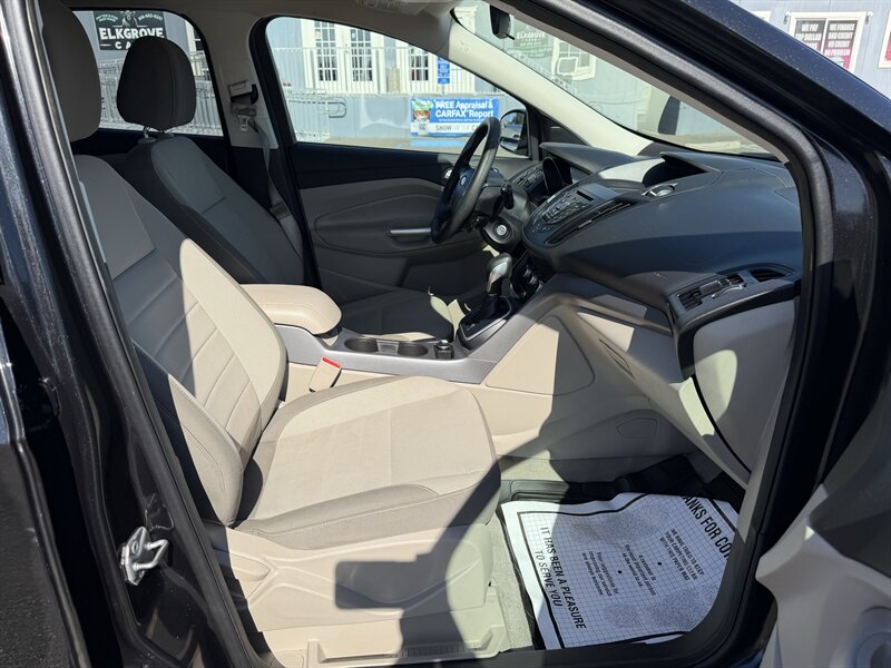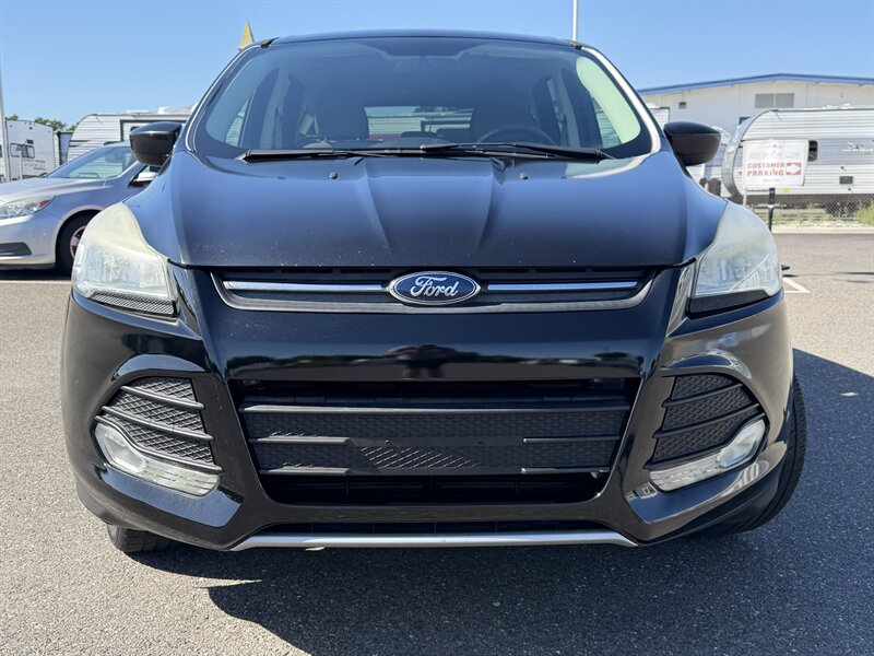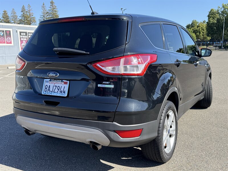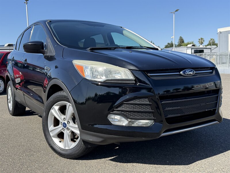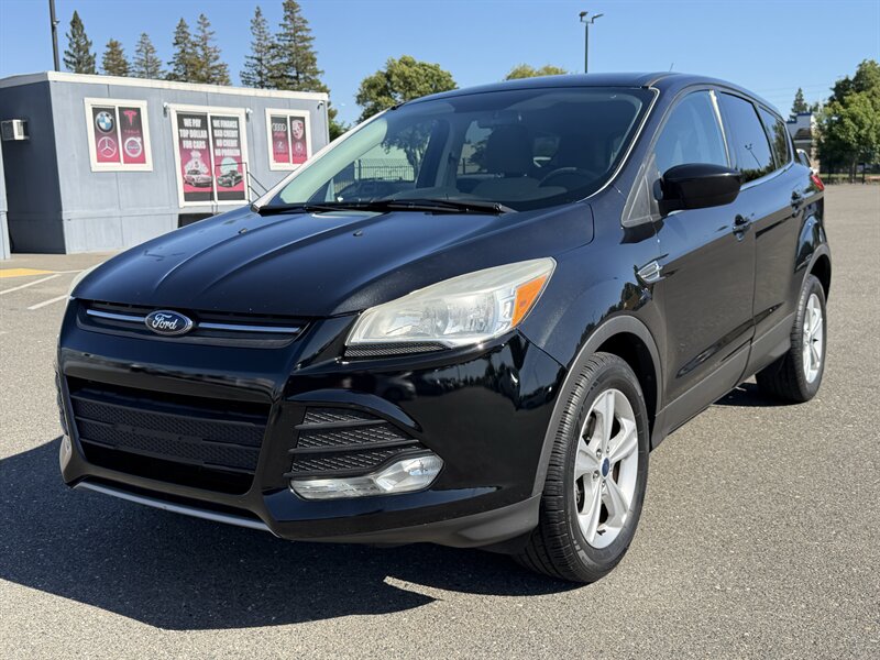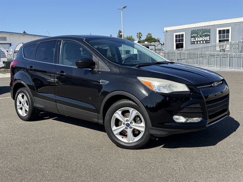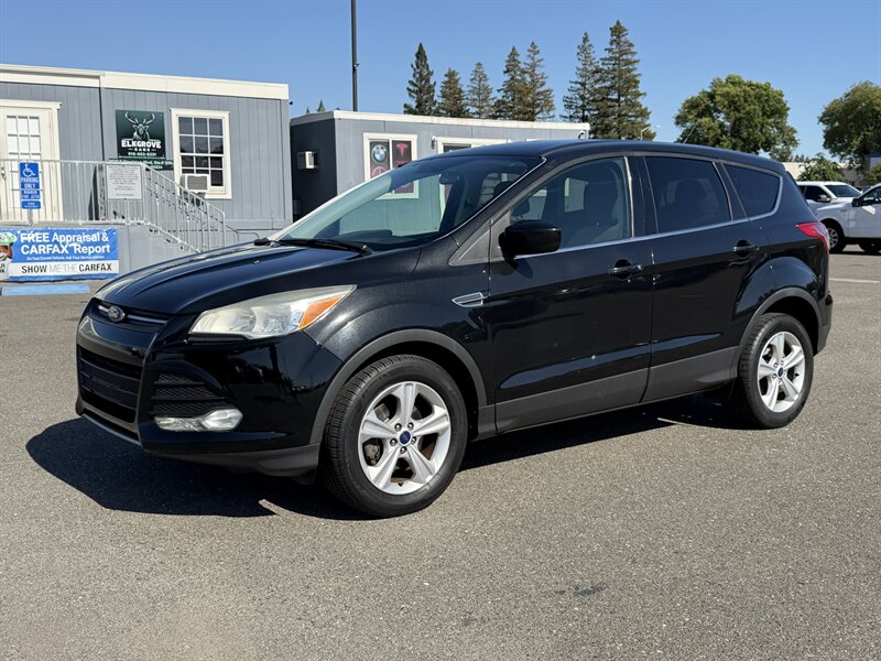 2014 Ford Escape SE — Black exterior, Gray cloth interior. Powered by an EcoBoost 1.6L Turbo I4 (178 hp, 184 lb-ft) paired with a 6-speed automatic; EPA-rated 23 MPG city / 32 MPG highway. Factory equipment includes Ford SYNC with Bluetooth and auxiliary input, AM/FM/CD audio, power windows/locks/mirrors, remote keyless entry, cruise control, cloth seating with 60/40 split-folding rear seat, air conditioning, alloy wheels, and safety systems such as ABS, stability and traction control, multiple airbags, and tire pressure monitoring. Vehicle is in excellent overall condition and has a clean CARFAX.