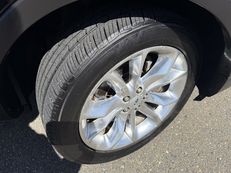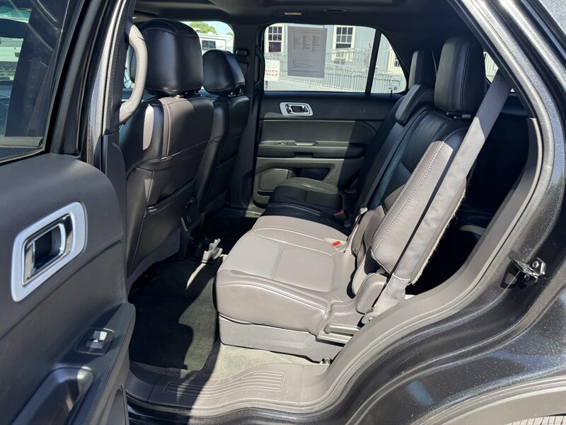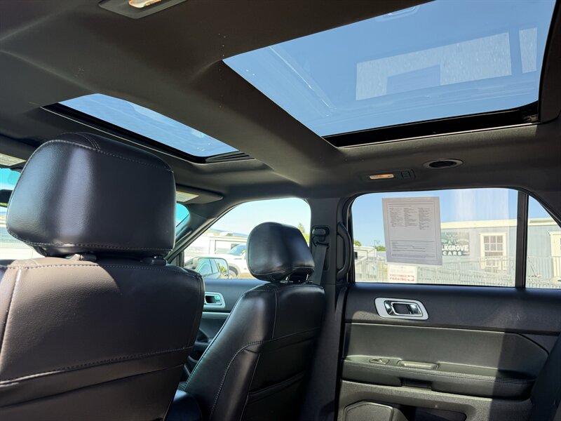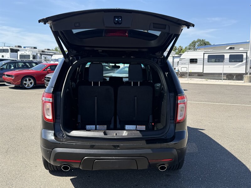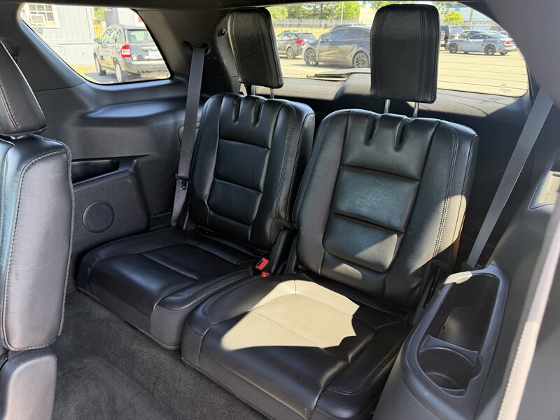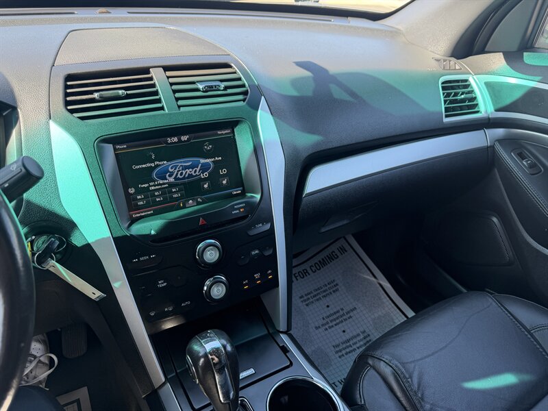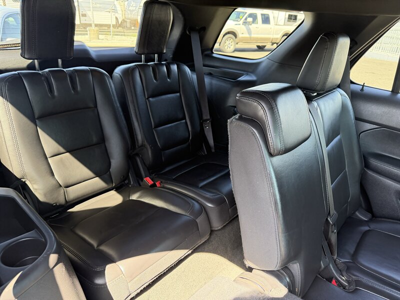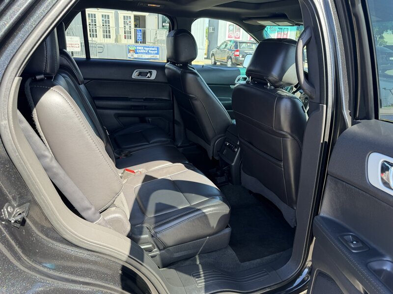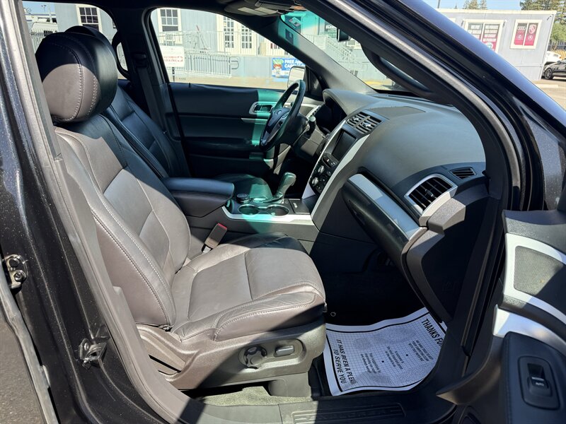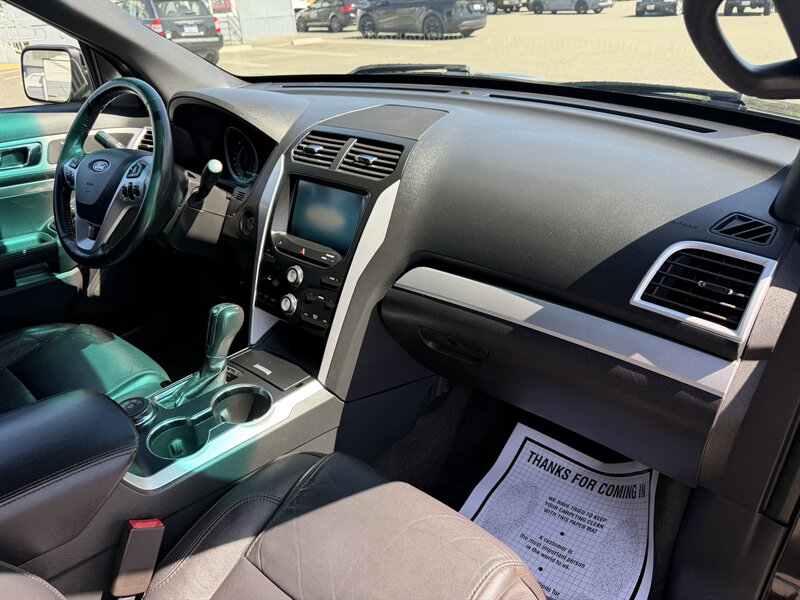 2014 Ford Explorer XLT — Black exterior with Black leather interior. Powered by the factory 3.5L V6 (290 hp, 255 ft-lbs) paired with a 6-speed automatic. Factory-standard features include seating for up to seven with third-row seats, power windows and door locks, remote keyless entry, cruise control, tilt/telescoping steering wheel, steering-wheel audio and phone controls with Ford SYNC Bluetooth, AM/FM/CD player with USB/AUX inputs, air conditioning with rear vents, alloy wheels, ABS, electronic stability and traction control, front-seat side airbags and full-length curtain airbags, and tire pressure monitoring. Below 116,000 miles (averaging under 9,000 miles/year), rated 17 MPG city / 23 MPG highway, excellent overall condition, clean CARFAX.