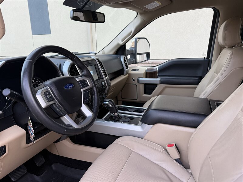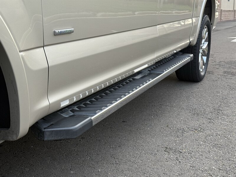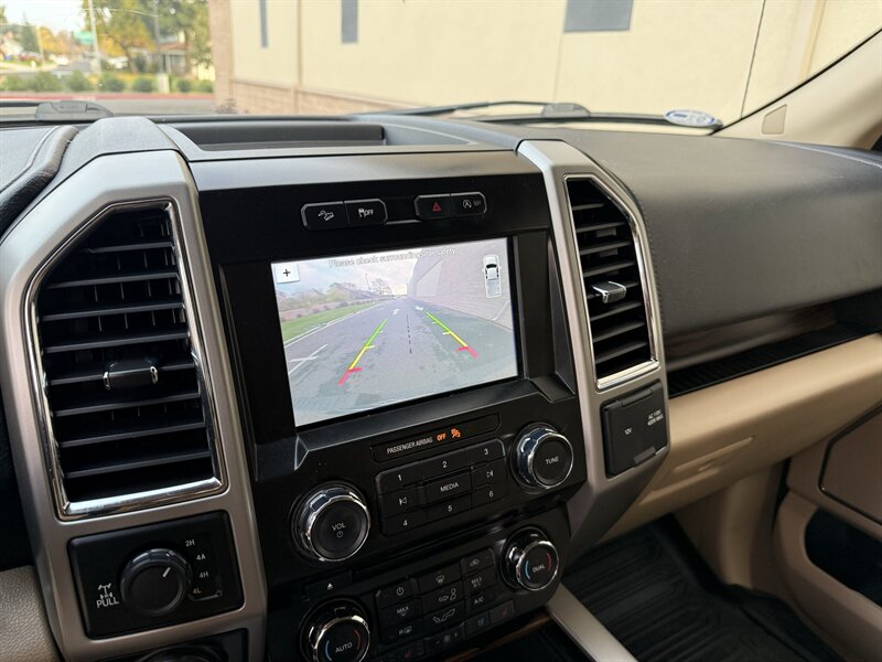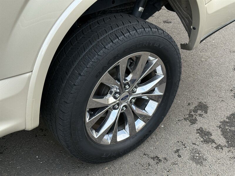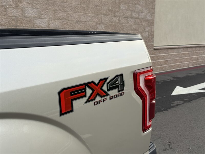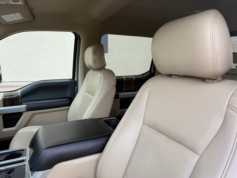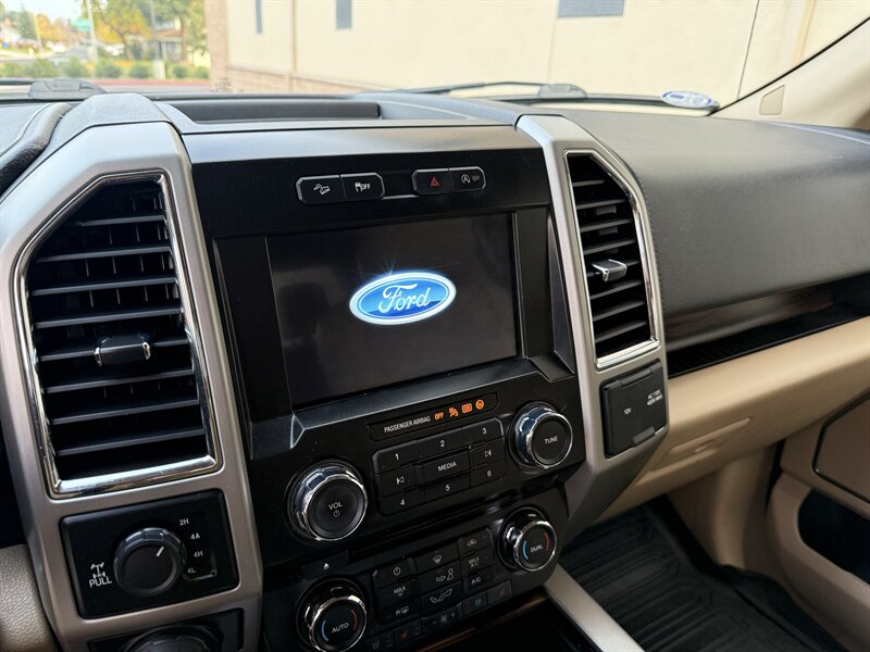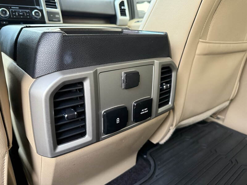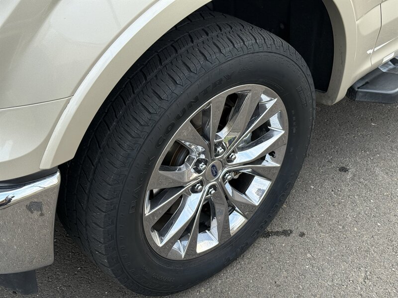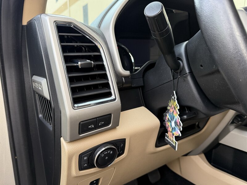 2017 Ford F-150 Lariat in White Gold with Medium Light Camel leather interior. Powered by a 3.5L EcoBoost twin-turbo V6 producing 375 hp and 470 lb-ft of torque, with an EPA-estimated 17 MPG city / 23 MPG highway. Factory-equipped Lariat appointments include leather-trimmed heated and ventilated front seats with power adjustments and driver memory, dual-zone automatic climate control, keyless entry with push-button start and remote start, touchscreen infotainment with Bluetooth and USB inputs, rearview camera, power windows/locks/mirrors, cruise control, alloy wheels, chrome exterior trim, tow package with trailer sway control, ABS, stability/traction control and full frontal/side airbag protection. Clean CARFAX report with one previous owner.